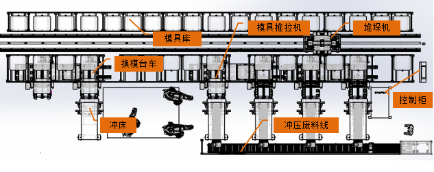 1.模具庫布置在沖床前面,在沖床和模具庫之間布置換模臺車。